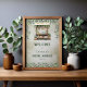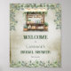Hermoso diseño de cartel de bienvenida con bosque y eucalipto verde salvia y boutique de Mercado de Agricultores. El fondo frontal envejecido rústico combinado con el soporte de madera cargado de vegetación y el eucalipto colgante circundante recuerda a un mercado italiano o campestre al aire libre.