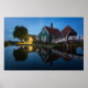 Impresión poster de una casa tradicional de madera usada como una granja de quesos con pintura verde con tejas rojas y reflejo en el agua al inicio de la noche al crepúsculo en el museo Zaanse Schans en Holanda.