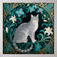 Indulge in luxurious elegance with this majestic gray tabby cat centered in an opulent Art Nouveau-inspired frame. Rich teal foliage, swirling golden vines, vibrant turquoise orchids, pristine white lilies, and delicate blue blossoms encircle the serene feline in intricate, gilded detail against a deep midnight background. The luminous eyes, soft fur texture, and harmonious jewel-toned palette create a sophisticated, enchanting, and timelessly romantic mood — perfect for cat lovers who adore vintage luxury and botanical grandeur.