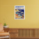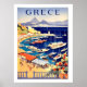 Cartel de viajes de Grecia que muestra barcos de pesca en el puerto, con paseo marítimo y las montañas a lo lejos.