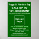 Poster verde para el Día de San Patricio que puede personalizar especificando el porcentaje de descuento, las fechas de venta, cargando el logotipo de su negocio, escribiendo su nombre de negocio, dirección, número de teléfono, correo electrónico y sitio web. Personalizar y muéstralo para atraer a más clientes a que compren sus productos o clientes para que les gusten sus servicios. Compruebe la apariencia después de cargar el logotipo y escribir textos. Si la apariencia le resulta agradable, puede realizar su pedido ahora. Si necesita cambiar el tamaño y la posición del logotipo y los textos para que encajen en este poster o en el tamaño y estilo que ha elegido, ajuste la herramienta de diseño. También puede cambiar el color de fondo, el color de fuente y el estilo de fuente en la herramienta de diseño. ¡Feliz Día de San Patricio! Le deseamos la mejor de las suertes, alegría y más ventas de esta fiesta.