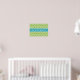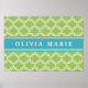 Trendy, modern, bold Moroccan tile inspired lattice trellis pattern in green and white with a bright blue name template.