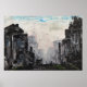 A cityscape stands shrouded in mist, with dark, textured buildings rising on either side of a deserted street. The contrast between the stark structures and the obscure background creates a mysterious and somber atmosphere.
