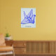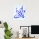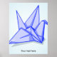Una imagen divertida para los fanáticos del origami. Una grúa de papel azul doblado sobre un fondo azul pálido.