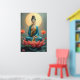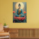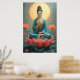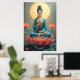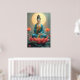 La pintura representa a Guanyin meditando en un florido loto rosa, su cara tranquila y serena con los ojos medio cerrados. Lleva una elegante bata azul adornada con oro, simbolizando pureza y gracia. Detrás de ella hay un halo resplandeciente, realzando su aura divina de paz. A su alrededor se encuentran delicadas flores de loto en tonos suaves y armoniosos, lo que crea una atmósfera de tranquilidad. El ángulo frontal y el estilo de pintura suave y detallado capturan su presencia pacífica y real.
