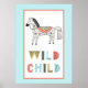Adorable arte popular de estilo escandinavo tanto en el gráfico del caballo dulce como en las letras que dicen "niño salvaje". Ilustración sobre fondo blanco con borde azul pastel