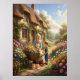 The image depicts a tranquil countryside scene in front of a charming thatched-roof cottage. An elderly woman, dressed in an apron, and a young boy in overalls are tending to a wooden wheelbarrow brimming with colorful flowers such as marigolds, daisies, and roses. The woman is carefully arranging the blossoms while the boy holds a small gardening fork, assisting her. A ginger-and-white cat rests peacefully on the stone path nearby, adding to the warmth of the moment. The cottage is surrounded by lush greenery and vibrant blooms, with a winding path leading into the distance. Bathed in golden sunlight, the scene radiates serenity, nostalgia, and the beauty of intergenerational bonding in nature.