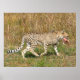 Perfil Chita africana (Acinonyx jubatus) caminando sobre el césped con carne en la boca