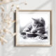 Realista retrato a lápiz de un gatito de tabby gris sobre una blanda manta con una guitarra acústica y flores.