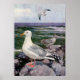 Un adulto y una gaviota inmadura de arenque americano (Larus smithsonianus) están sobre las rocas de la orilla. El agua es verde y está agitada, pero parece violeta a lo lejos. Estas aves también son conocidas como gaviotas Smithsonian. Un ilustracion vintage de 1922 para un libro sobre la historia natural de las aves.