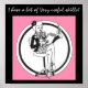 Rubio con piernas largas y tacones altos sentados en la silla listos para tomar dictado. "¡Tengo muchas habilidades muy útiles!" Los colores son rosa y negro