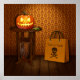 Temeroso ilustracion de Halloween: Calabaza espeluznante con dulces sobre una vieja mesa redonda de madera con telarañas. A la izquierda una bolsa de "Trick or Treat" de Halloween con un cráneo y huesos impresos.