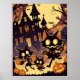 Three Halloween cats play in front of a spooky haunted house, surrounded by glowing jack-o’-lanterns under the full moon. A perfect Halloween night scene full of mystery and charm.