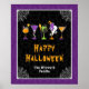 This fun and spooky party sign features Halloween themed cocktails with decorations such as a witch's hat, broomstick and cauldron, ghost, bat, pumpkins and eyeballs. In the background is a black and purple damask pattern with spider webs. The text combines decorative and serif fonts for a stylish and modern look. This is perfect for a Halloween fancy dress costume party.