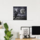Un aterrador ilustracion de Halloween: Paisaje espeluznante de noche con luna llena, nubes y una silueta de árbol oscuro con araña colgante.