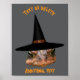 Cara de sapo de aspecto medio con una letra de poster de bruja gorra de Halloween. Diseño de Susan.