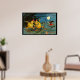A beautiful vintage Halloween poster featuring two pumpkin characters running away from a witch.