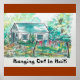 Watercolor of a small house in Haiti and clothes drying outside on the clothes-line, with letters in black: Hanging Out In Haiti; brown background and black border