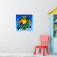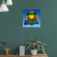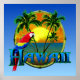 Pintura de puesta de sol en la playa de Hawaii con palmeras, marco redondo de bambú y un loro colorido.