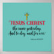 Hebreos 13:8 Versículo de la Biblia KJV “Jesucristo es el mismo ayer, hoy y por siempre.” Póster con texto en letra script roja y negra y una cruz cristiana dorada. ¡Disfruta!