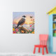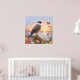 Un pájaro colorido encaramado en medio de flores junto a una tranquila playa al atardecer, evocando tranquilidad y belleza natural.