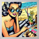 Una encantadora señora en la playa con una revista de mediados de los años 50, un cóctel de limonada y gafas de sol. Arte de arte pop retro estilo de historietas ai art.