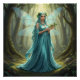 Una hermosa hada con un traje de color turquesa y un collar de piedras turquesas con turquesa y holly en su largo cabello turquesa y sus alas de libélula iridiscente sosteniendo una rama holly en un mágico bosque rodeado de hierba, rocas y árboles cubiertos de viñas.