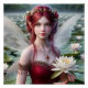 Un hermoso hada de cabello rojo con alas blancas vestida con un vestido rojo bonito y un collar de rubí sostiene una liga de agua mientras está parado en un estanque lleno de nenúfares.