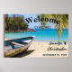 Un poster de bienvenida boda con una idílica playa tropical. Agua azul turquesa cristalina y una playa de arena fina de color marrón. Algunas hojas de palmera cuelgan desde arriba. En la playa hay una vieja barca de madera. Un paisaje tranquilo y sereno.