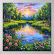 pintura de una hermosa puesta de sol sobre un río con flores