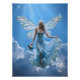 Un hermoso hada de cabello plateado con alas irrisorias y un vestido azul claro que fluye flotando sobre las nubes contra un cielo azul mientras se vierte agua de un cántaro. Ella representa a Aquarius, el portador de agua.