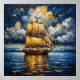 Hermoso barco a vela representado contra un cielo dramático. El barco cuenta con velas grandes y ondulantes que captan la luz, creando un cálido tono dorado. El fondo está lleno de azules intensos y nubes oscuras intercaladas con vibrantes toques dorados, lo que sugiere una puesta de sol o un amanecer. El agua serena refleja los colores del cielo, lo que realza la tranquilidad general de la escena. La textura en la pintura da una sensación de movimiento a las olas y las velas, invitando a los espectadores a imaginar el barco navegando por las aguas abiertas.