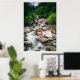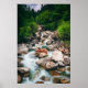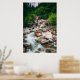 Fotografía paisajística de un hermoso río que atraviesa un lecho rocoso de río en un día nublado de primavera con árboles verdes alrededor.