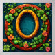 Marco ovalado dorado de herradura y trébol adornado con flores vibrantes y hojas verdes exuberantes. El fondo es oscuro, resaltando la flora colorida y dando un toque caprichoso e inspirado en la naturaleza a la composición.
