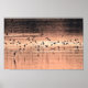 Vol d'hirondelles au coucher du soleil sur un étang, elles chassent les insectes proches de l'eau. Embellissez votre intérieur avec ce poster aux couleurs du coucher de soleil.