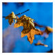 Vista de cerca de una hoja de roble seca iluminada por la luz del sol de marzo. Fondo azul oscuro. Mantengan la calma, viene la primavera.