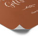 Este cartel de terracota con hoja mínima para tarjetas y regalos es perfecto para una boda boho o una despedida de soltera. El diseño presenta una simple silueta de hoja de vegetación en un tono naranja quemado terroso con un estilo bohemio desértico minimalista. La línea de texto en la parte inferior del cartel se puede personalizar con la fecha, los nombres de la novia y el novio, o un mensaje corto como "Gracias". Este cartel se puede utilizar para una boda o cualquier evento o fiesta.