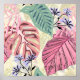 Póster Hojas tropicales rosas y verdes, flores azules.