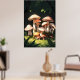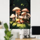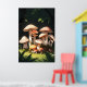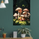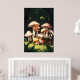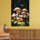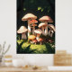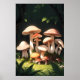 Un conjunto de setas, algunas con gorras blancas y otras con gorras rojas, naranjas o marrones, se retrata en un entorno de vegetación exuberante. Las setas están dispuestas en semicírculo, con sus tallos que emergen de un lecho de musgo y hojas verdes. El fondo es un bosque oscuro y sombrío, con la luz del sol filtrándose a través de las hojas e iluminando las setas.