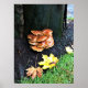 Una escena de otoño muy única con un grupo de hongos creciendo a la base de un árbol y coloridas hojas que los rodean en el suelo. Foto tomada en octubre de 2017, en mi barrio de Wilsonville, Oregón.