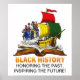 La imagen presenta un libro abierto con olas que emergen de sus páginas. Encima de las olas hay un barco con velas de color rojo, amarillo y verde. En el barco hay varias personas vestidas con diferentes vestimentas históricas y contemporáneas, que representan diferentes épocas y profesiones. Debajo del libro, el texto dice "HISTORIA NEGRA" en negrita y en letras degradadas. Debajo de eso, en un texto más pequeño, dice "HONRAR EL PASADO, INSPIRAR EL FUTURO". Esta poderosa imagen simboliza el viaje y las contribuciones de los individuos negros a lo largo de la historia, enfatizando la importancia de recordar y honrar su pasado mientras inspiran a las futuras generaciones.