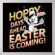 Este poster alegre y vibrante es la manera perfecta de celebrar la anticipación de la temporada de Semana Santa. En el centro, un alegre conejo blanco de Pascua de estilo personalizado sostiene huevos de Pascua a rayas decorativos en ambas manos. El conejito tiene una sonrisa ancha, feliz y grandes orejas rosas, que irradian alegría festiva. El texto es audaz y atractivo, puesto sobre un fondo negro sólido: "HOPPY DAYS AHEAD" usa oro brillante y un brillante gradiente de oro a rosa, respectivamente, haciendo que la palabra "HOPPY" destaque. "EASTER IS COMING!" se muestra de forma destacada en letras de gradiente grandes que pasan de un color rosa suave a un color de melocotón. Este poster es ideal para añadir un toque divertido, festivo y estacional a cualquier espacio, sobre todo para decorar una casa, un aula o un negocio durante las vacaciones de primavera y Semana Santa.