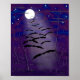 Se acerca la hora fascinante, con murciélagos, una luna llena blanca, estrellas y siluetas de árboles en esta huella poster.