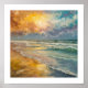 Esta impresionante pintura al óleo capta la impresionante belleza de una puesta de sol dorada en una playa de arena. Los tonos vivos de naranja, amarillo y violeta pintan el cielo, mientras que las olas suaves del océano abren a la orilla. Esta pieza le dará un toque de tranquilidad y serenidad a cualquier casa u oficina.