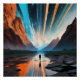Un viajero solitario camina entre montañas altísimas reflejadas en aguas tranquilas, mientras el cielo arde con vigas cósmicas de luz. La escena mezcla naturaleza y universo, invitando a la reflexión sobre el viaje interior y la vastedad de los sueños humanos.