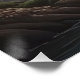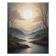 Un río tranquilo fluye entre montañas suaves, bajo el resplandor silencioso de un sol que abraza el horizonte. Árboles esbeltos y sombras suaves evocan una paz contemplativa, donde el tiempo parece suspendido en la belleza de la naturaleza.