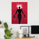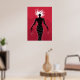 Poster chica demócrata con un ilustracion vectorial que representa a un extraño personaje femenino negro - fantasma escalofriante con cabello blanco, ojos malignos rojos y manos deformadas con largas uñas sobre fondo rojo. Este monstruo extraño lleva un vestido parecido a un alambre de púas con picos de vidrio.