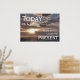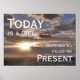 Hoy es un regalo, por eso se llama el presente. Despierta cada mañana con un inspirador paisaje de decoración motivacional con presupuesto de autoayuda. Escenario vertical de un dramático cielo de amanecer matutino, con nubes, y el sol mirando a través de la cubierta de la nube con un naranja temprano y cielo azul sobre las olas del océano. Luz solar brillante con rayos de luz de cruce, orientación horizontal. Todos los diseños Copyright © 2013 www.CuteComfy.com