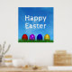 Feliz ilustracion de Pascua con coloridos huevos de Pascua pintados en el césped con el cielo azul en la parte trasera y la tipografía de "Feliz Pascua" escrita con nubes blancas.