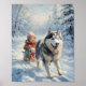 Un Perro Husky está jalando a un niño feliz y sonriente en un paisaje de nieve.